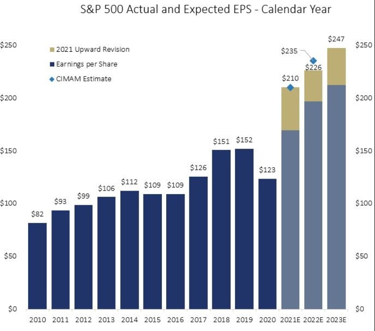 With elevated household savings and slower projected COVID-19 cases, we anticipate economic growth will remain robust through the first half of the year. This means companies will hire and wages will increase, leading to greater consumer confidence and corporate earnings. After two consecutive years of money supply boosts and near-zero interest rates globally, earnings have recovered swiftly from 2020 and even surpassed 2019. We anticipate the largest 500 companies in the U.S., as tracked by the S&P 500 Index, to have average earnings per share of $235 in 2022.